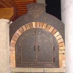 Schmiedeeiserne, zweiflügelige Kamintür an einem Pizzaofen – einzigartige Accessoires in einem Weinkeller
